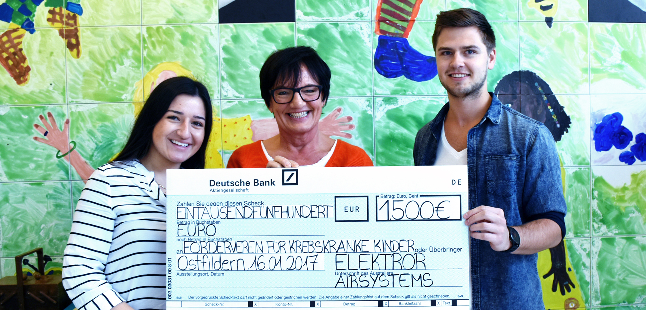 The apprentices Maximilian Hanninger and Miriana Zoumaia handed over their symbolic cheque to the „Förderverein für krebskranke Kinder e.V.” on Monday, 16 January 2017. It is very important for the manufacturer of industrial fans to support this project every year. Last year the apprentices visited the so-called parents’ house, so this year it was possible to visit the children’s clinic. Each visit makes Elektror aware of the importance of donations and how even small donations can improve the children’s stay at the clinic. Donations are used for painting walls, buying comfortable seats for visitors or improving nursing, care and therapy.