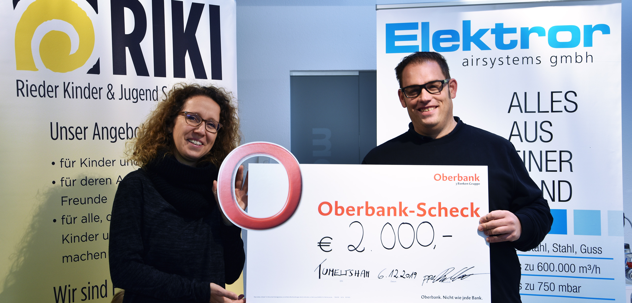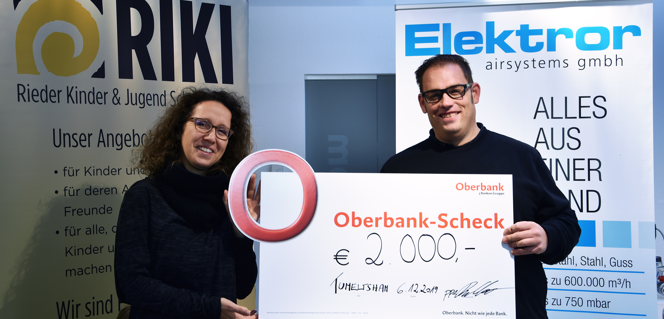 Frau Mag. Elisabeth Vormayr nahm am 6. Dezember 2019 freudig den dringend benötigten Scheck von Herrn Reischauer, Geschäftsführer der Firma Elektror airsystems gmbh in Tumeltsham, entgegen.