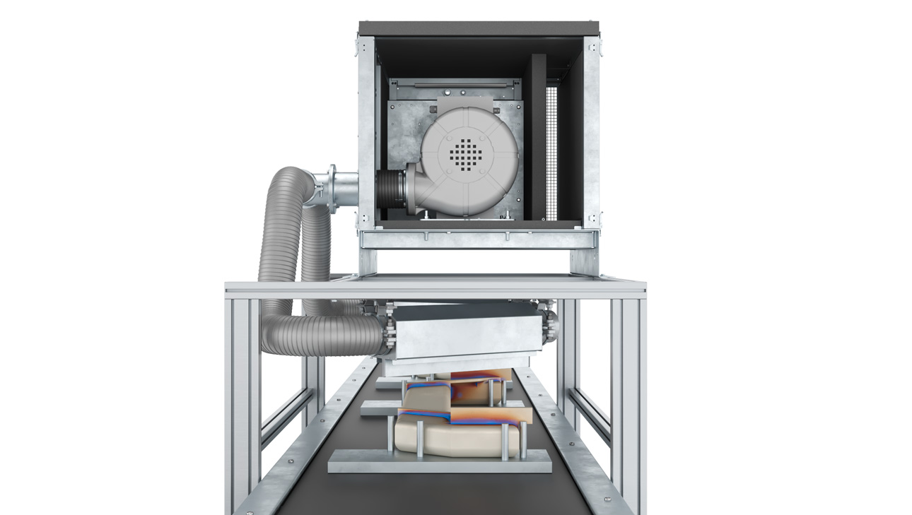 Die Elektror Ingenieure entwickeln die individualisierten Schalldämmhauben spezifisch für den jeweiligen Einsatzfall. Dabei werden Anwendung, Anlage, Ventilatortyp und Produktionsumgebung berücksichtigt. Das System lässt sich in bestehende Anlagen integrieren, auch bei großen Ventilatoren wie dem RD 92 oder S-HE 540.