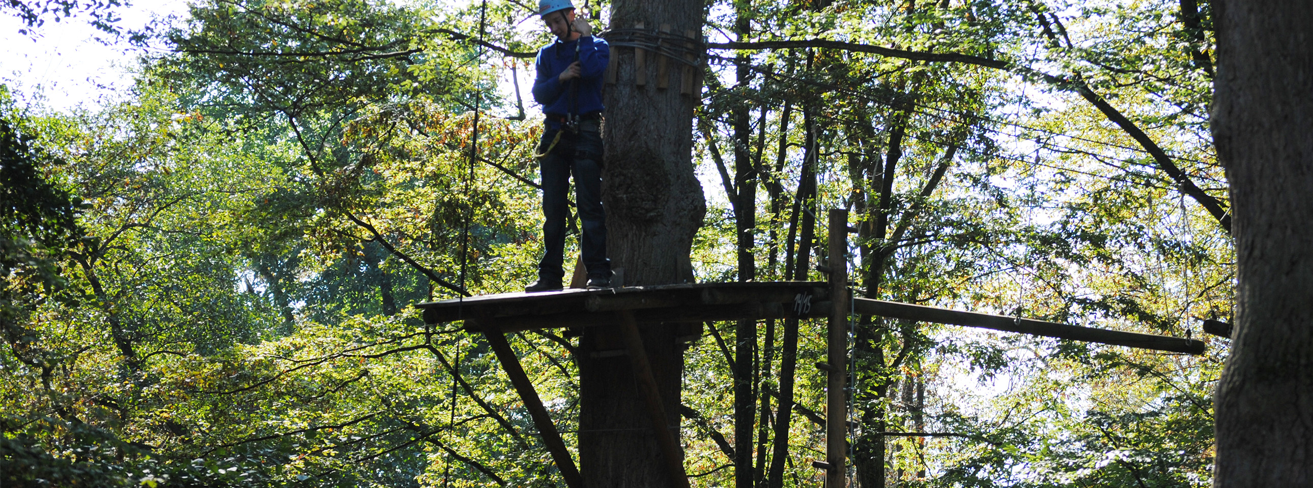 Im Hochseilgarten angekommen bekamen wir unsere Kletterausrüstung inklusive Helm. Nachdem wir alle die Ausrüstung angelegt hatten, gab es eine ausführliche Einweisung in das SSB Sicherungssystem und die Regeln des Hochseilgartens. Bereits hier wurde klar, dass man ohne einen Kletterpartner nicht weit kommt. Teamwork war ein wichtiger Punkt der Einweisung. Nach der Einführung mussten wir einen kurzen Kletterparcour absolvieren um zu zeigen, dass wir das Gelernte verstanden haben. Nach circa zehn Minuten war der Letzte von uns fertig und wir machten uns ans „richtige“ Klettern.