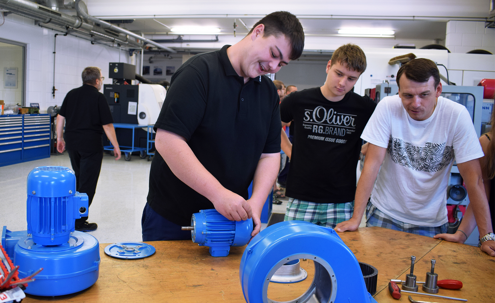 Besides all apprentices the trainers Mr. Schmitt and Mr. Wilhelm were present to welcome all visitors and answer questions. At different machines the children could test their technical skills. So for example at the CNC-milling-machine they could produce key chains engraved with their names or they could install a blower. At the electronics room the apprentices had built up an electropneumatical control to explain control procedures. Furthermore all visitors could take part in guided tours through the Production Center. So they saw the whole production process of an industrial blower.