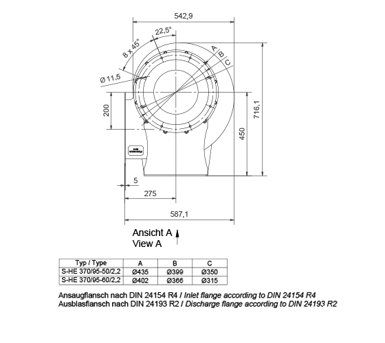 Fino a 260 m³/min e 4.800 Pa. Giranti con pale rovesce ad elevata efficienza in acciaio. Elevata efficienza energetica, basso consumo di energia. Alloggiamento in acciaio. Possibilità di collegamento variabili.